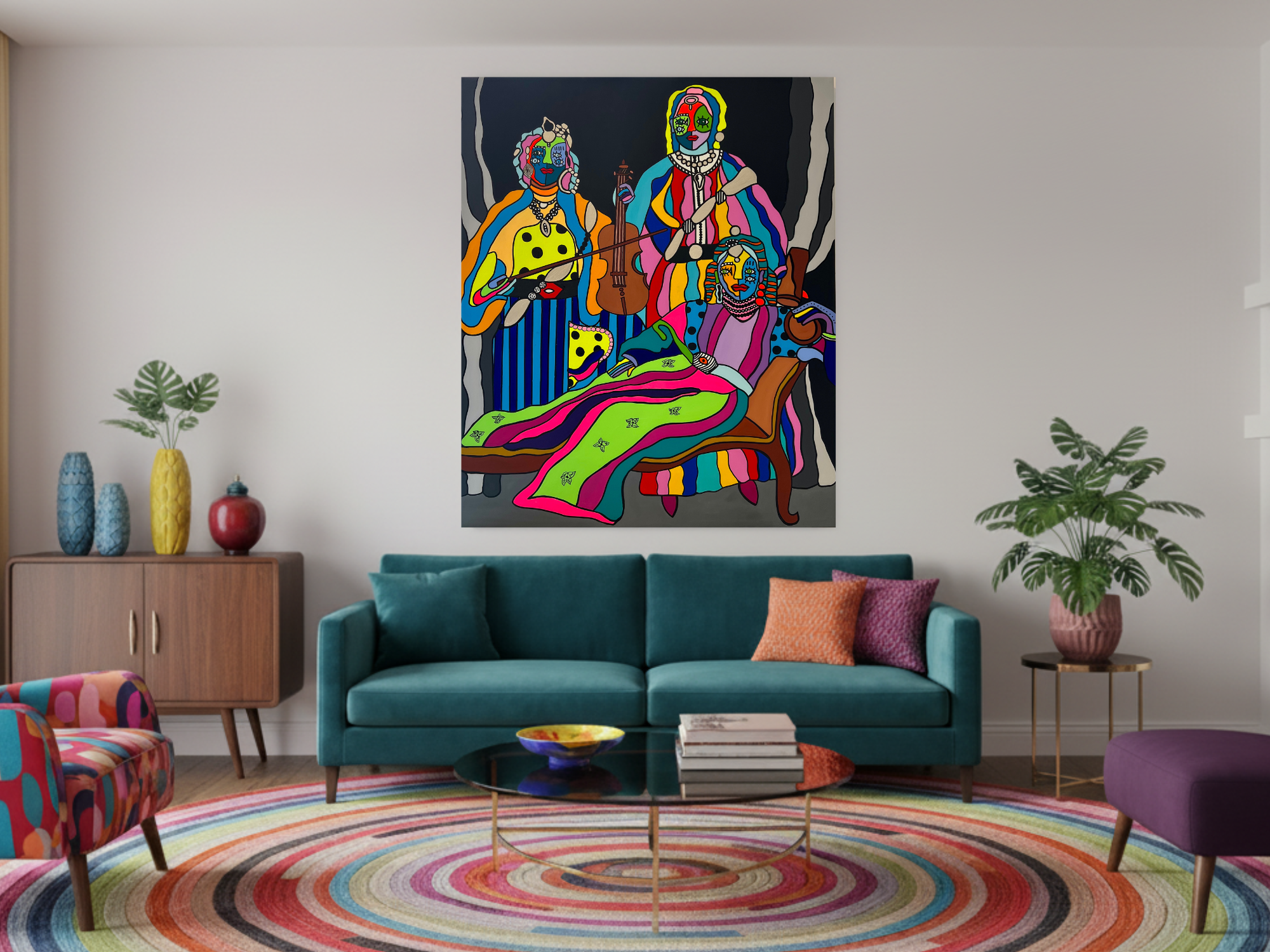 Aita: A Symphony of Rebellion A vibrant ode to the ancestral rhythm of the Moroccan plains, this piece from the Sound of Colors series captures the soul of Aita. Featuring a trio of Shikhat figures in a fusion of traditional attire and pop-art aesthetics, the painting visualizes the "cry" of the music through electric hues, bold patterns, and the hypnotic gaze of the performers.